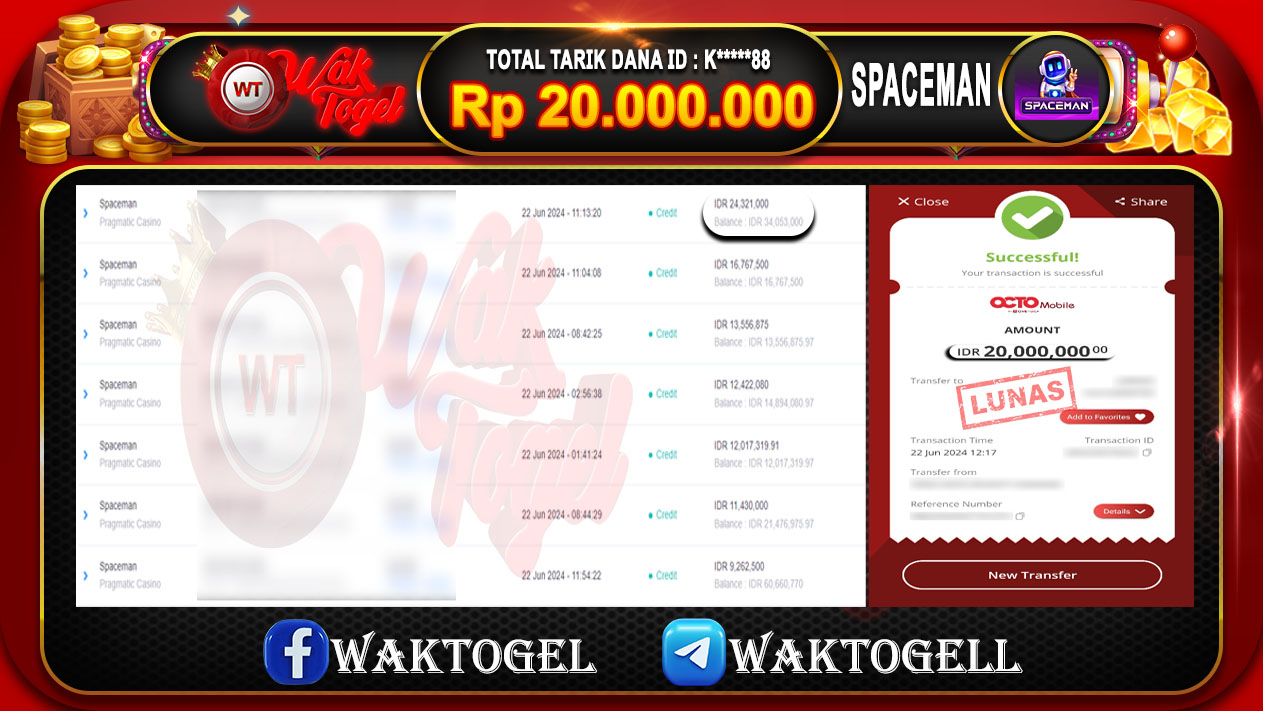 BUKTI PEMBAYARAN SLOT WAKTOGEL RP. 20.000.000 – GAME : SLOT SPACEMAN (USER ID : K*****88) TANGGAL |22-06-2024| CASH LUNAS !