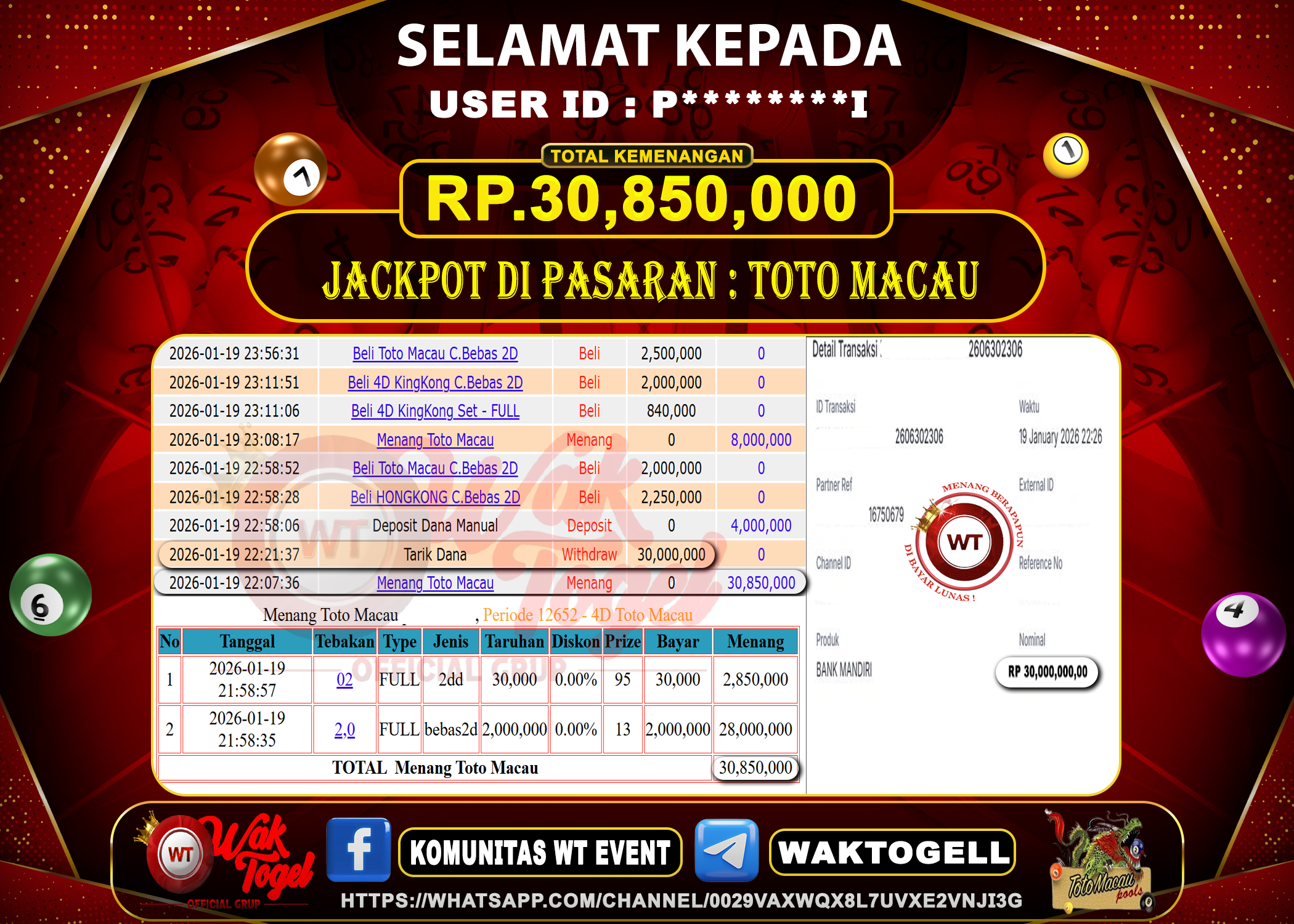 BUKTI PEMBAYARAN TOTO MACAU WAKTOGEL BUKTI PEMBAYARAN TOTO MACAU WAKTOGEL RP. 30,850,000 – GAME : TOGEL TOTO MACAU POOLS (USER ID : P********I) TANGGAL |20-01-2026| […]