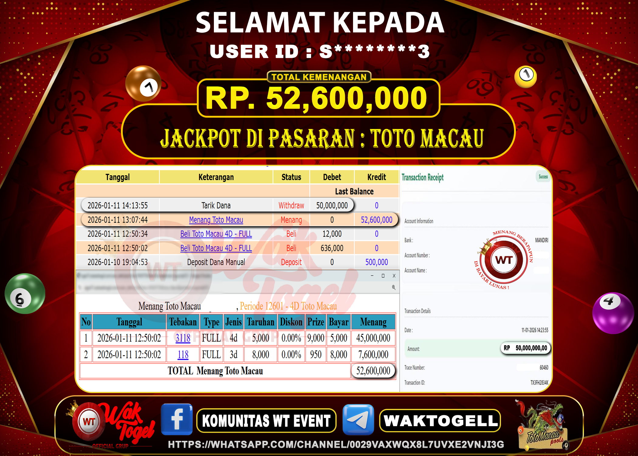 BUKTI PEMBAYARAN TOTO MACAU WAKTOGEL BUKTI PEMBAYARAN TOTO MACAU WAKTOGEL RP. 52,600,000 – GAME : TOGEL TOTO MACAU POOLS (USER ID : S********3) TANGGAL |11-01-2026| […]