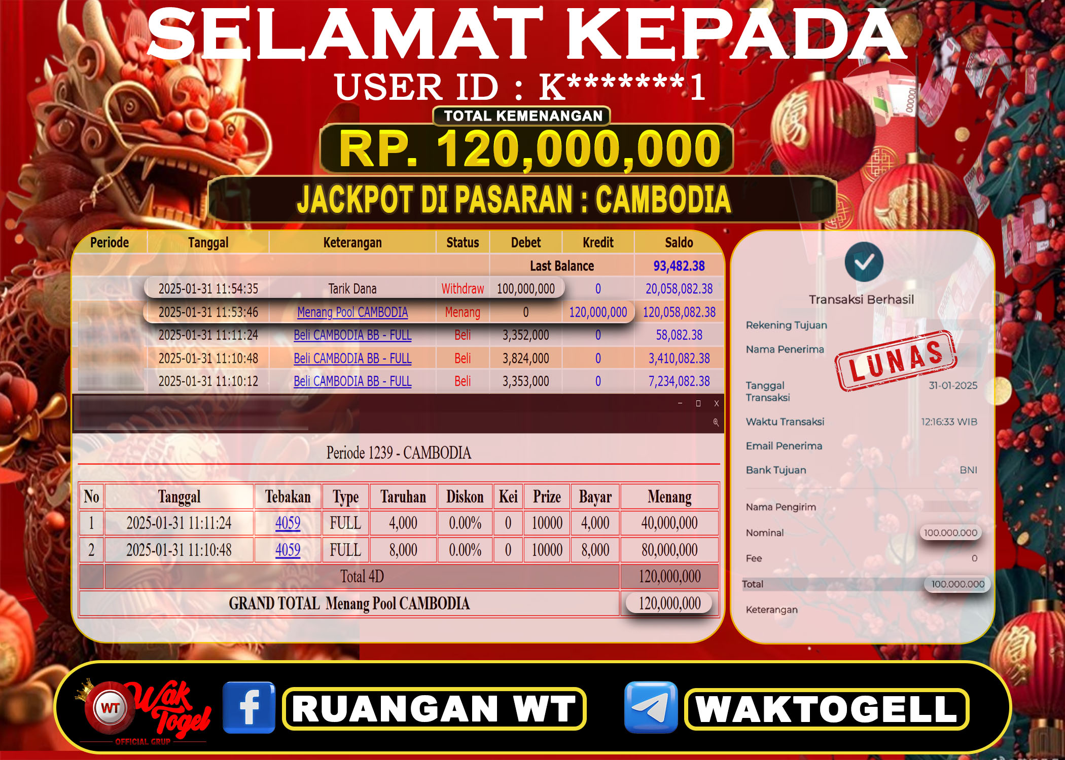 BUKTI PEMBAYARAN CAMBODIA WAKTOGEL BUKTI PEMBAYARAN CAMBODIA WAKTOGEL RP. 120,000,000 – GAME : TOGEL CAMBODIA POOLS (USER ID : K*******1) TANGGAL |31-01-2025| CASH LUNAS! Kami […]