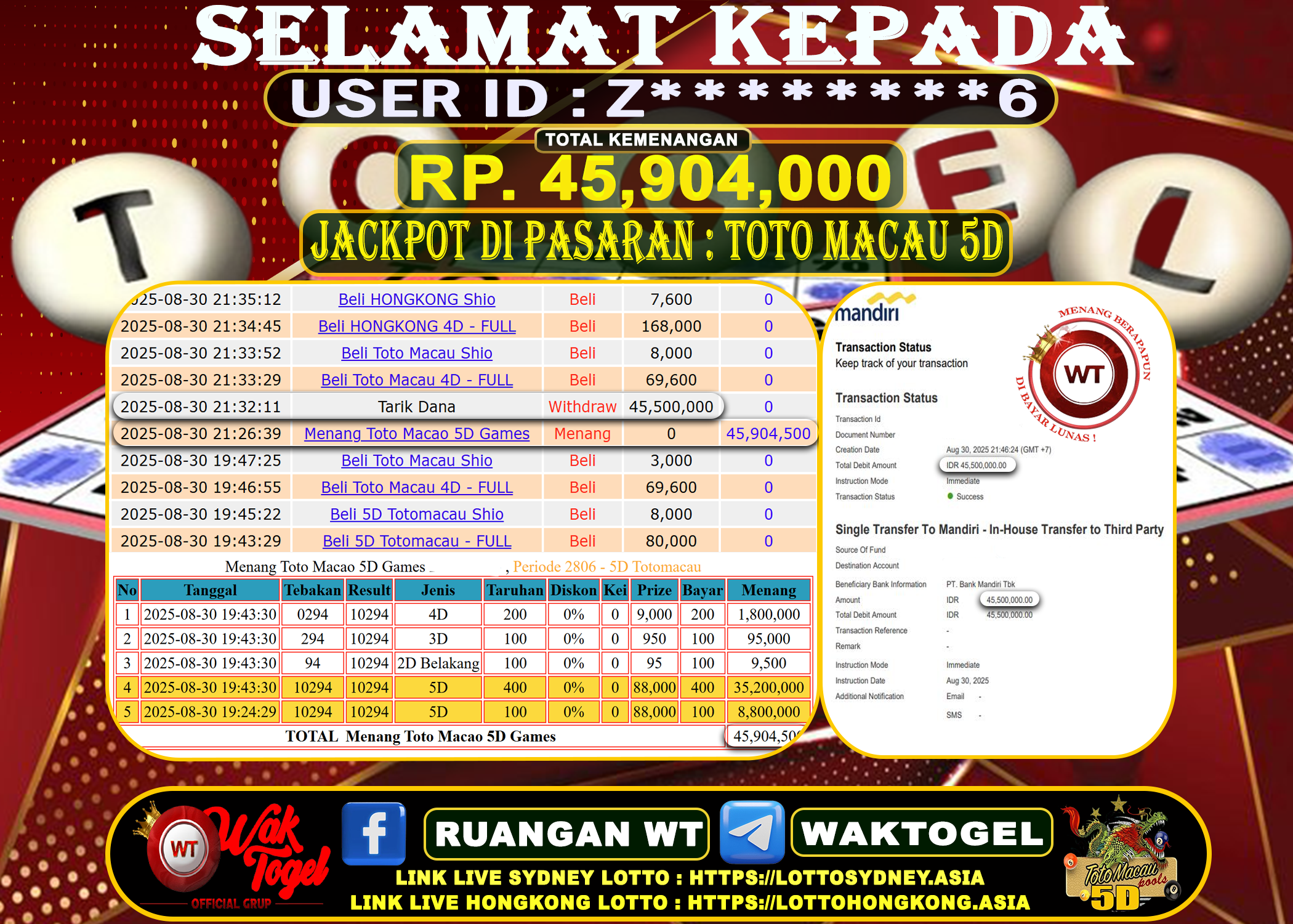 JACKPOT TOGEL WAKTOGEL BUKTI PEMBAYARAN TOTO MACAU 5D WAKTOGEL By JPWT Agustus 31, 2025 0 comments 2 min read BUKTI PEMBAYARAN TOTO MACAU 5D WAKTOGEL BUKTI PEMBAYARAN TOTO MACAU 5D WAKTOGEL RP. 45,904,000 – GAME : TOGEL TOTO MACAU 5D POOLS (USER ID : […]