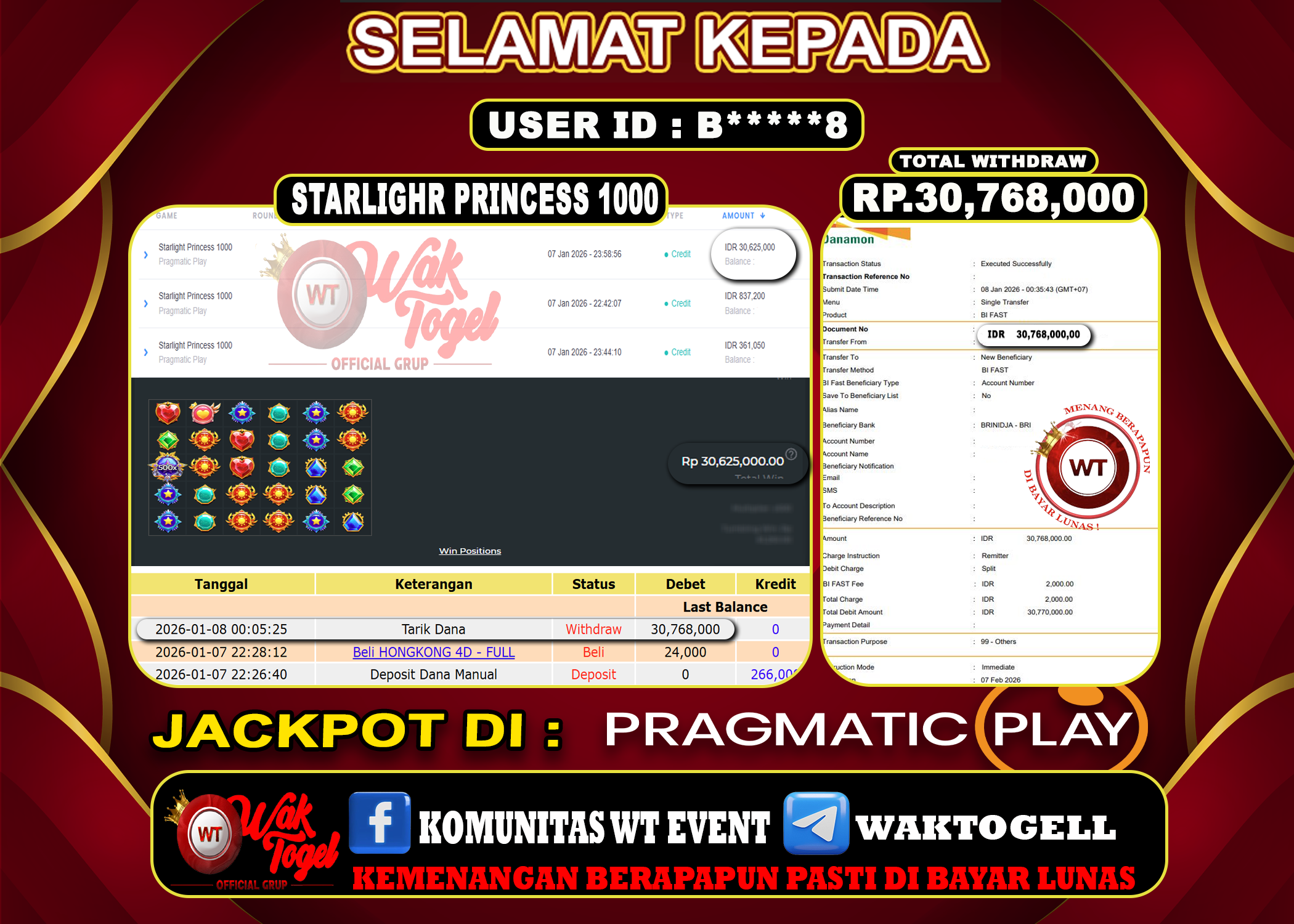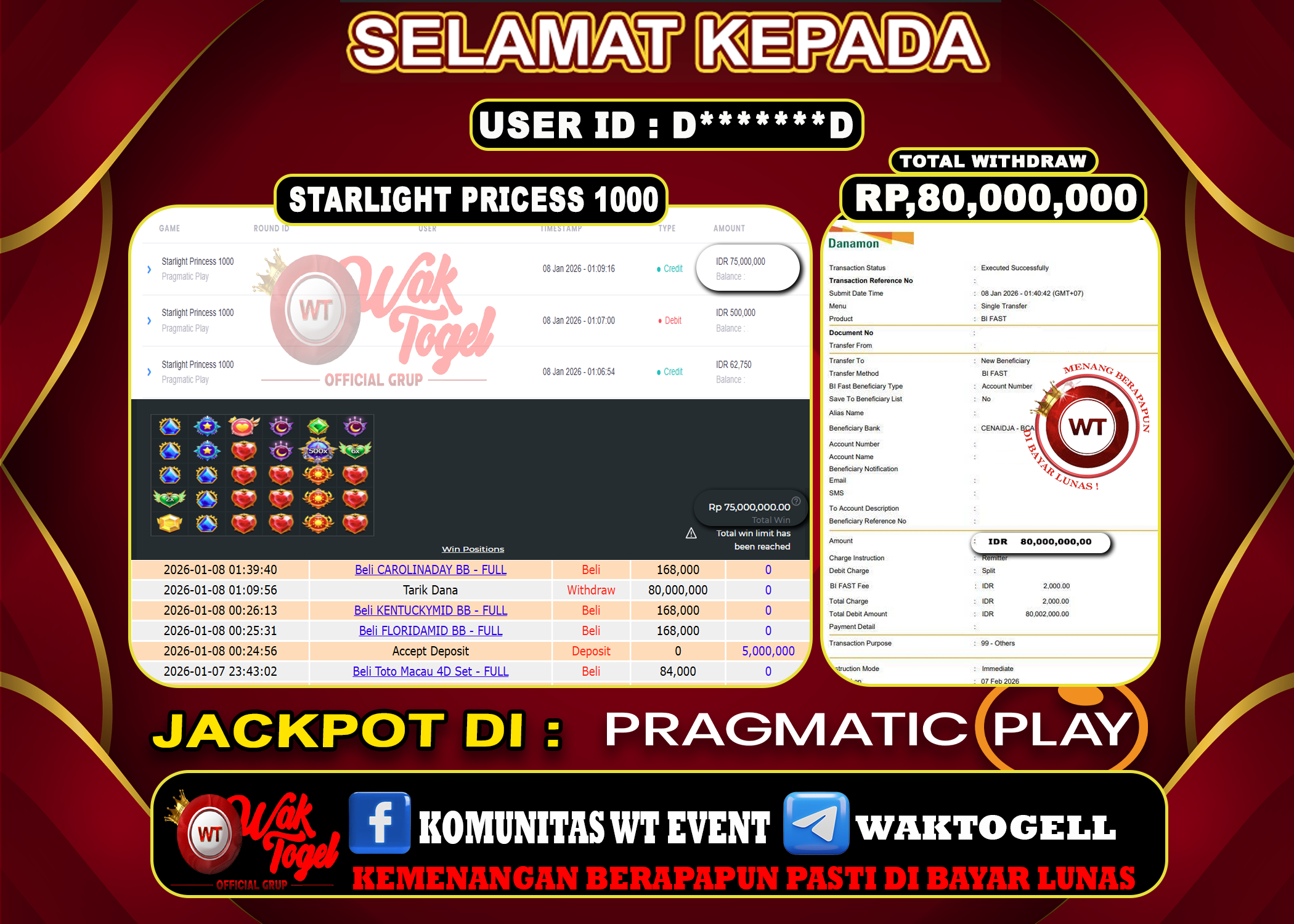 JACKPOT SLOT WAKTOGEL BUKTI PEMBAYARAN SLOT WAKTOGEL By JPWT Januari 8, 2026 0 comments 2 min read BUKTI PEMBAYARAN SLOT WAKTOGEL BUKTI PEMBAYARAN SLOT WAKTOGEL RP. 80,000,000 – GAME : SLOT STARLIGHT PRINCESS 1000 (USER ID : D*******D)TANGGAL|08-01-2026| CASH LUNAS ! Kami […]