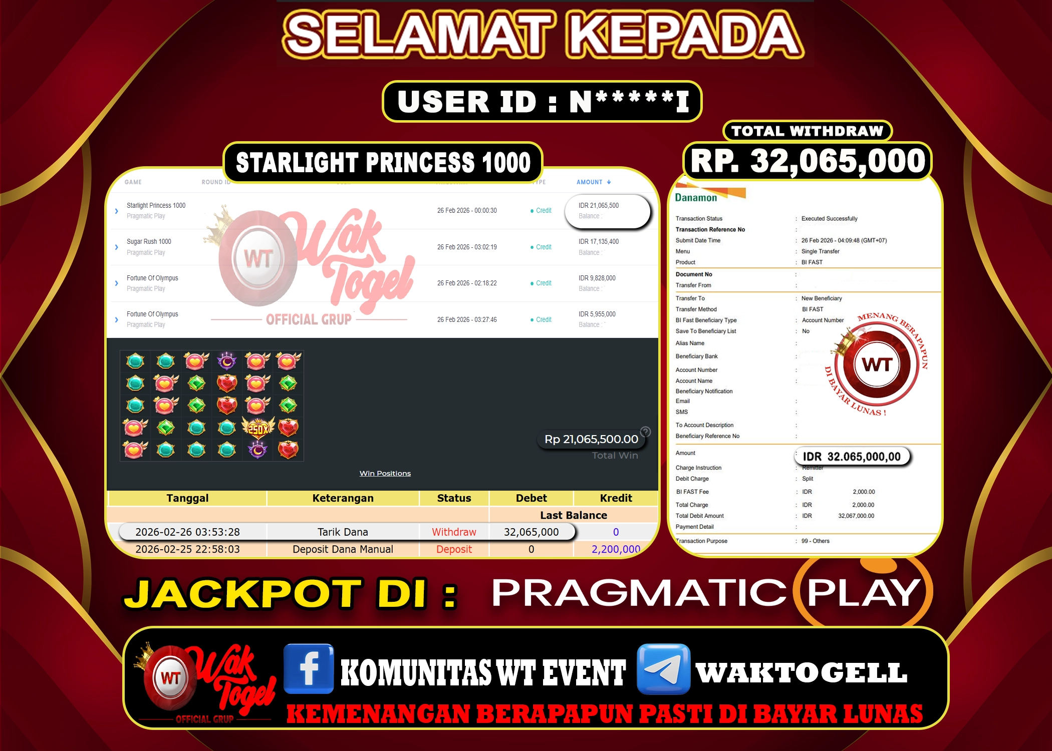 JACKPOT SLOT WAKTOGEL BUKTI PEMBAYARAN SLOT WAKTOGEL By JPWT Februari 26, 2026 0 comments 2 min read BUKTI PEMBAYARAN SLOT WAKTOGEL BUKTI PEMBAYARAN SLOT WAKTOGEL RP. 32,065,000 – GAME : SLOT STARLIGHT PRINCESS 1000 (USER ID : N*****I)TANGGAL|26-02-2026| CASH LUNAS ! Kami […]