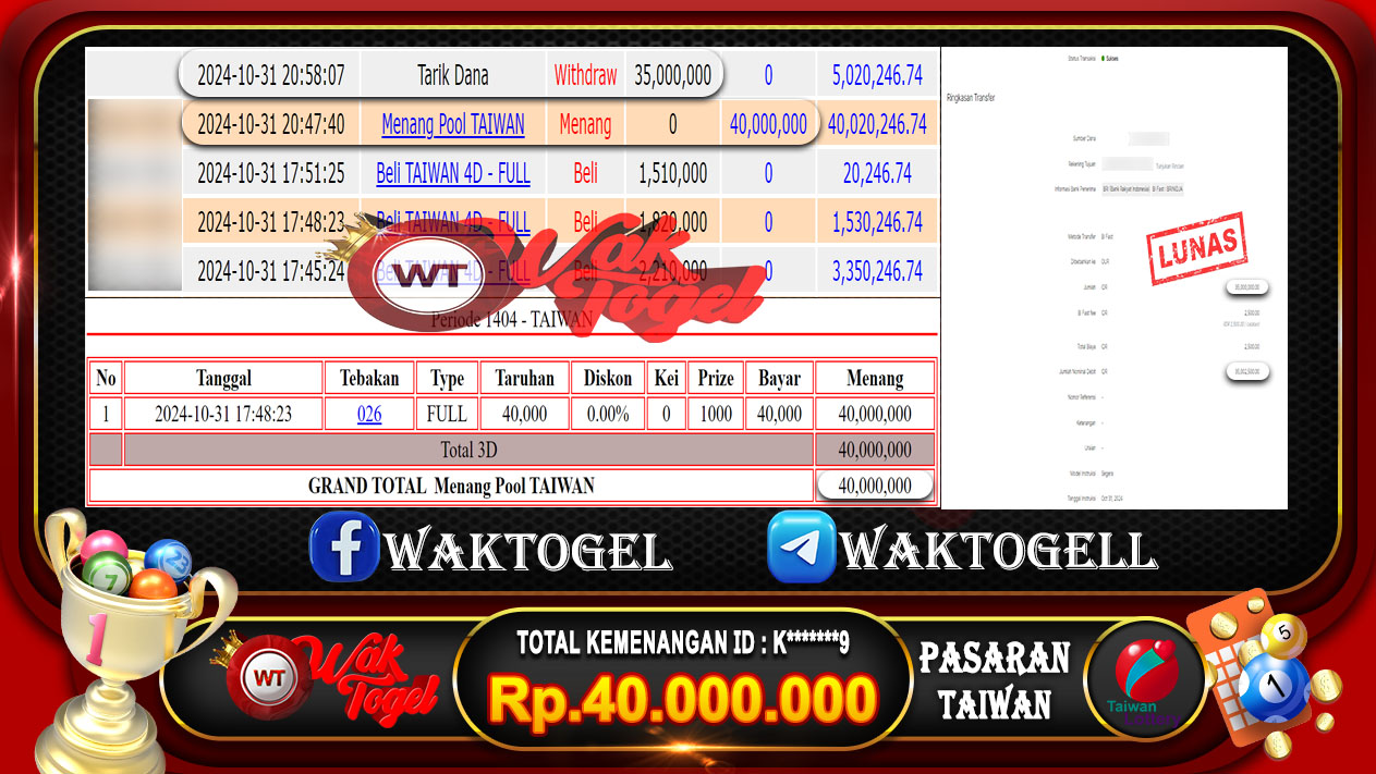 JACKPOT TOGEL WAKTOGEL BUKTI PEMBAYARAN TAIWAN WAKTOGEL By JPWT November 8, 2024 0 comments 2 min read BUKTI PEMBAYARAN TAIWAN WAKTOGEL BUKTI PEMBAYARAN TAIWAN WAKTOGEL RP. 30.00.000 – GAME : TOGEL TAIWAN POOLS (USER ID : T****5)TANGGAL|08-11-2024| CASH LUNAS ! Kami ucapkan […]