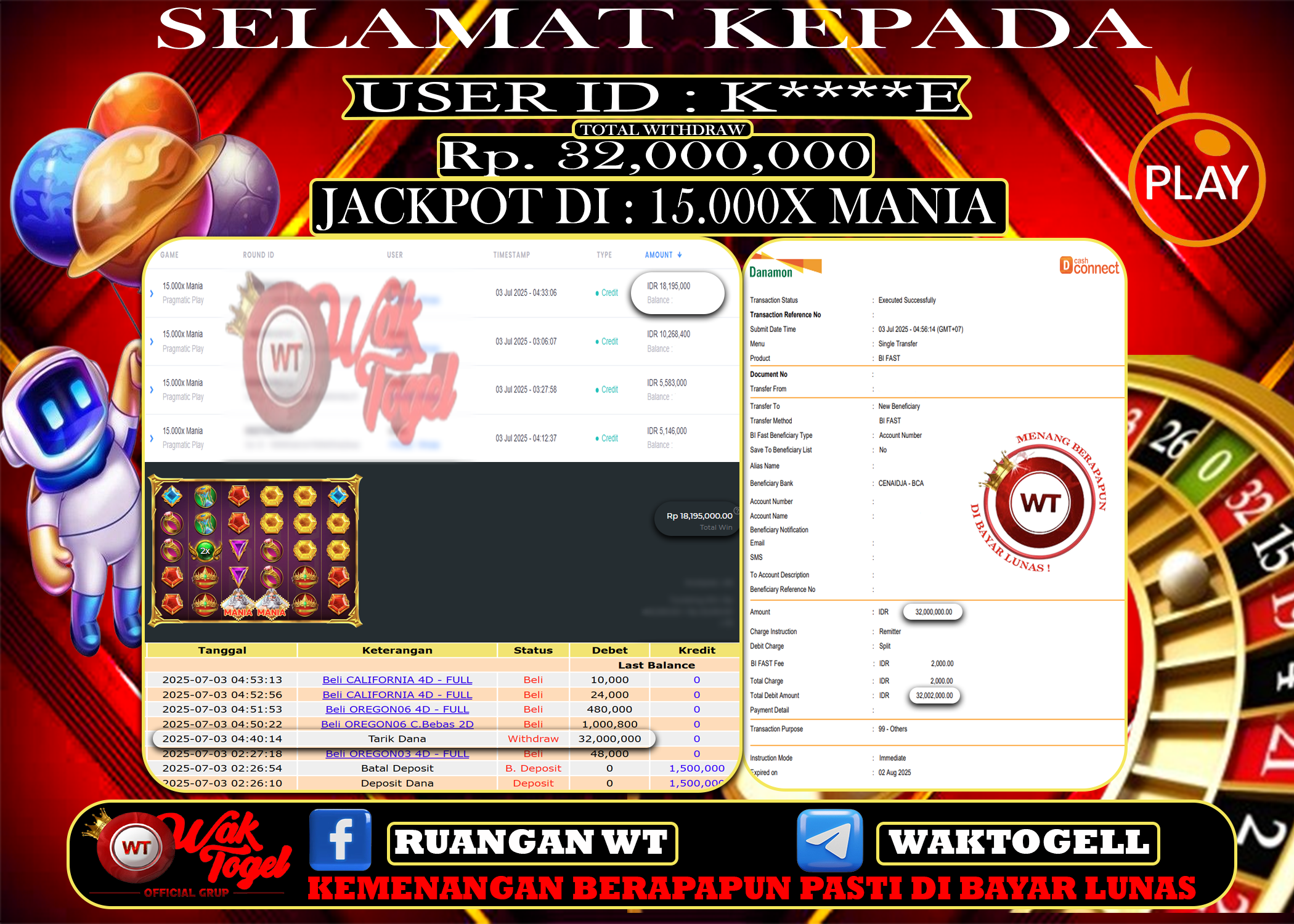 JACKPOT SLOT WAKTOGEL BUKTI PEMBAYARAN SLOT WAKTOGEL By JPWT Juli 3, 2025 0 comments 2 min read BUKTI PEMBAYARAN SLOT WAKTOGEL BUKTI PEMBAYARAN SLOT WAKTOGEL RP. 32,000,000 – GAME : SLOT 15.000X MANIA (USER ID : K****E) TANGGAL |03-07-2025| CASH LUNAS ! […]