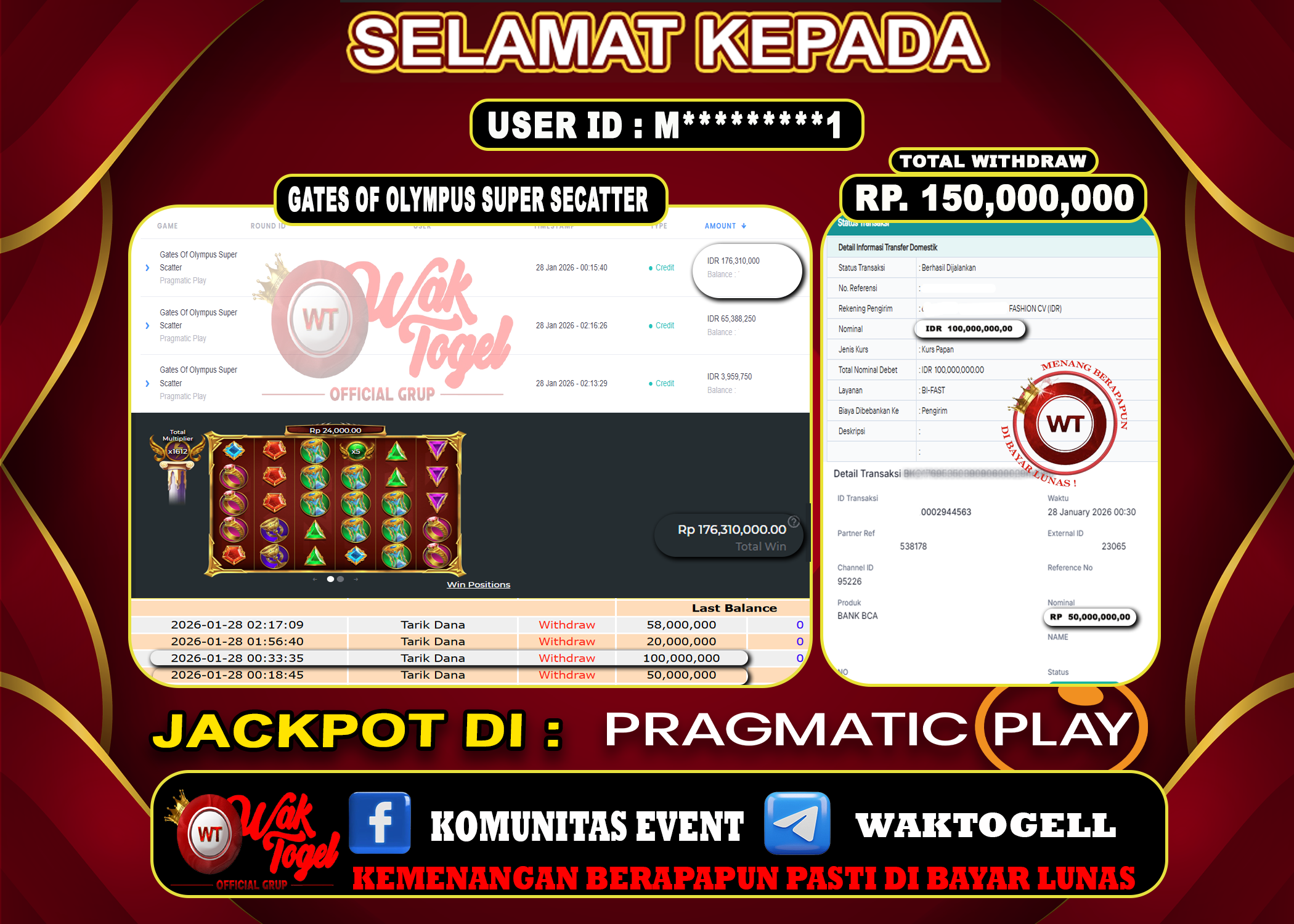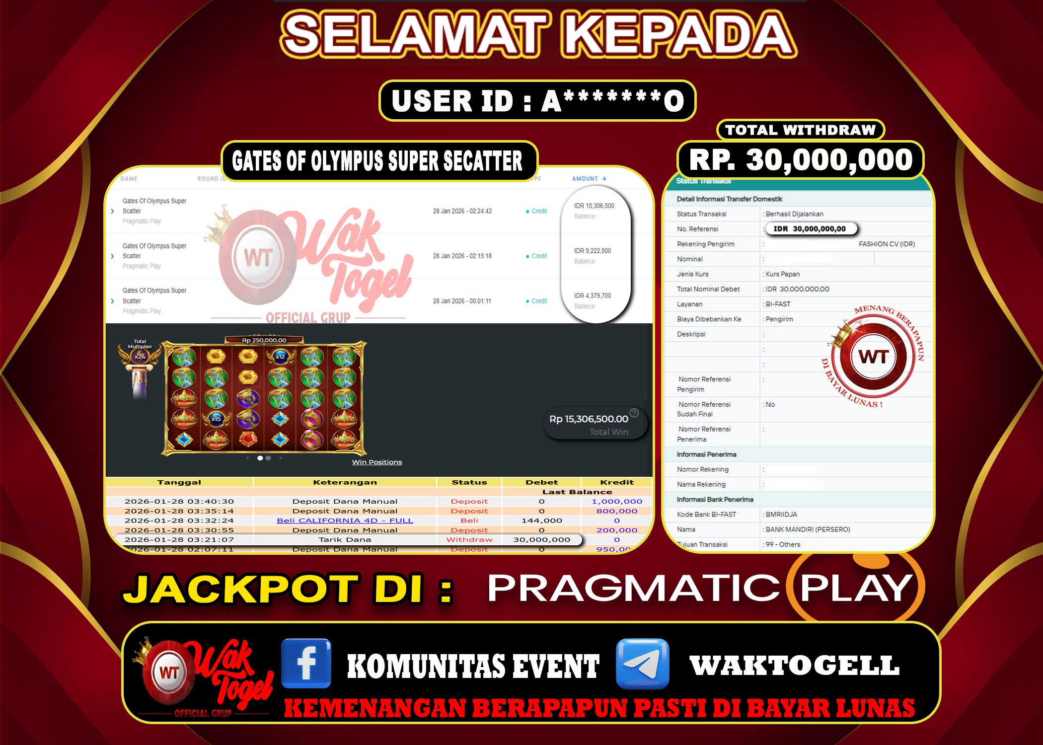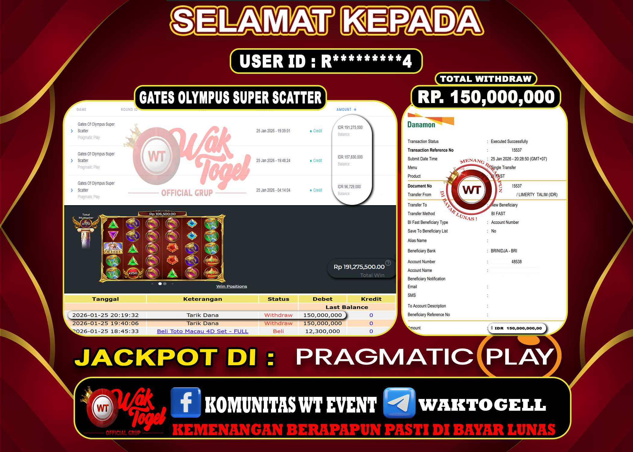 JACKPOT SLOT WAKTOGEL BUKTI PEMBAYARAN SLOT WAKTOGEL By JPWT Januari 25, 2026 0 comments 2 min read BUKTI PEMBAYARAN SLOT WAKTOGEL BUKTI PEMBAYARAN SLOT WAKTOGEL RP. 150,000,000 – GAME : SLOT GATES OF OLYMPUS SUPER SCATTER (USER ID : R*********4) TANGGAL |25-01-2026| […]