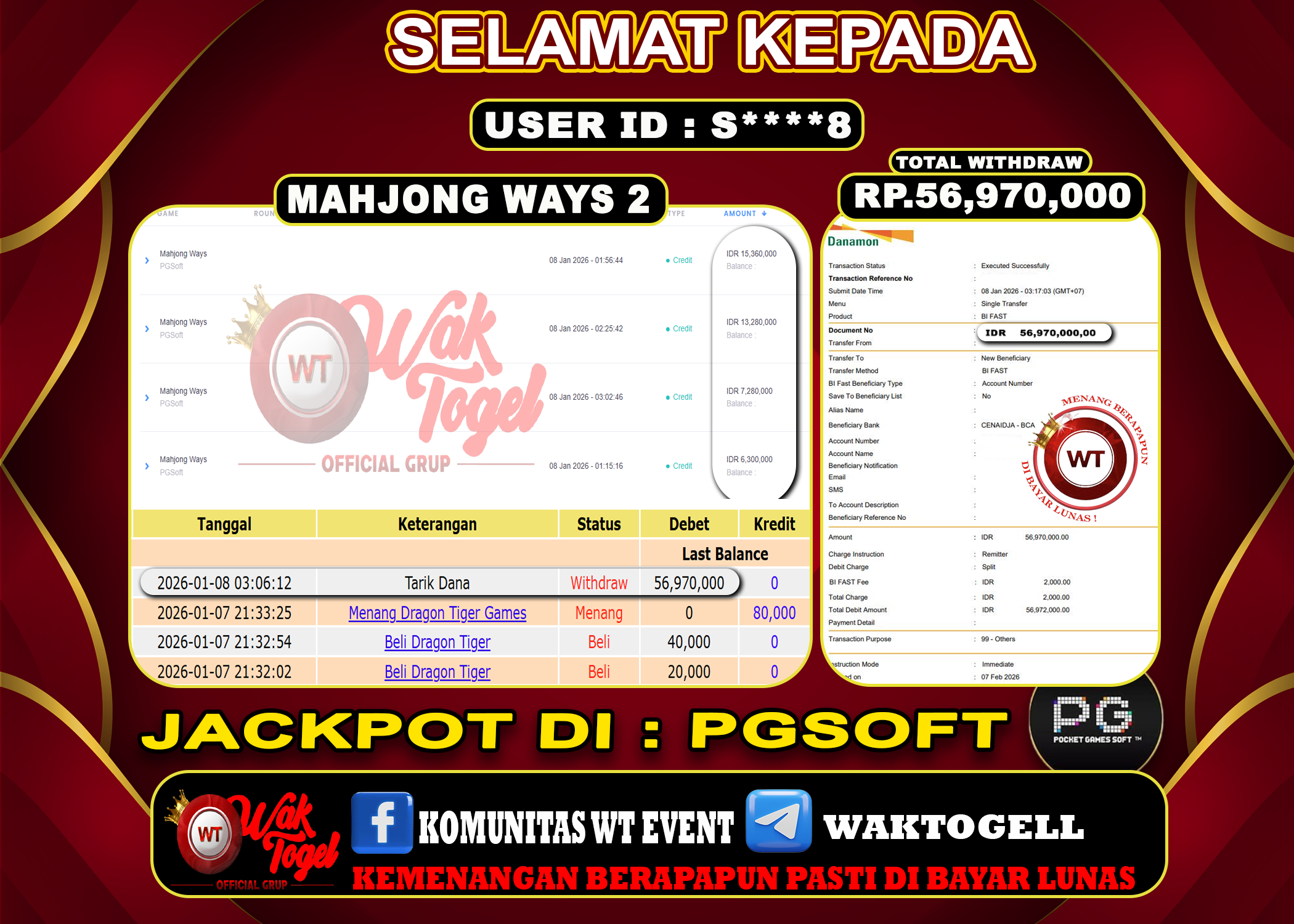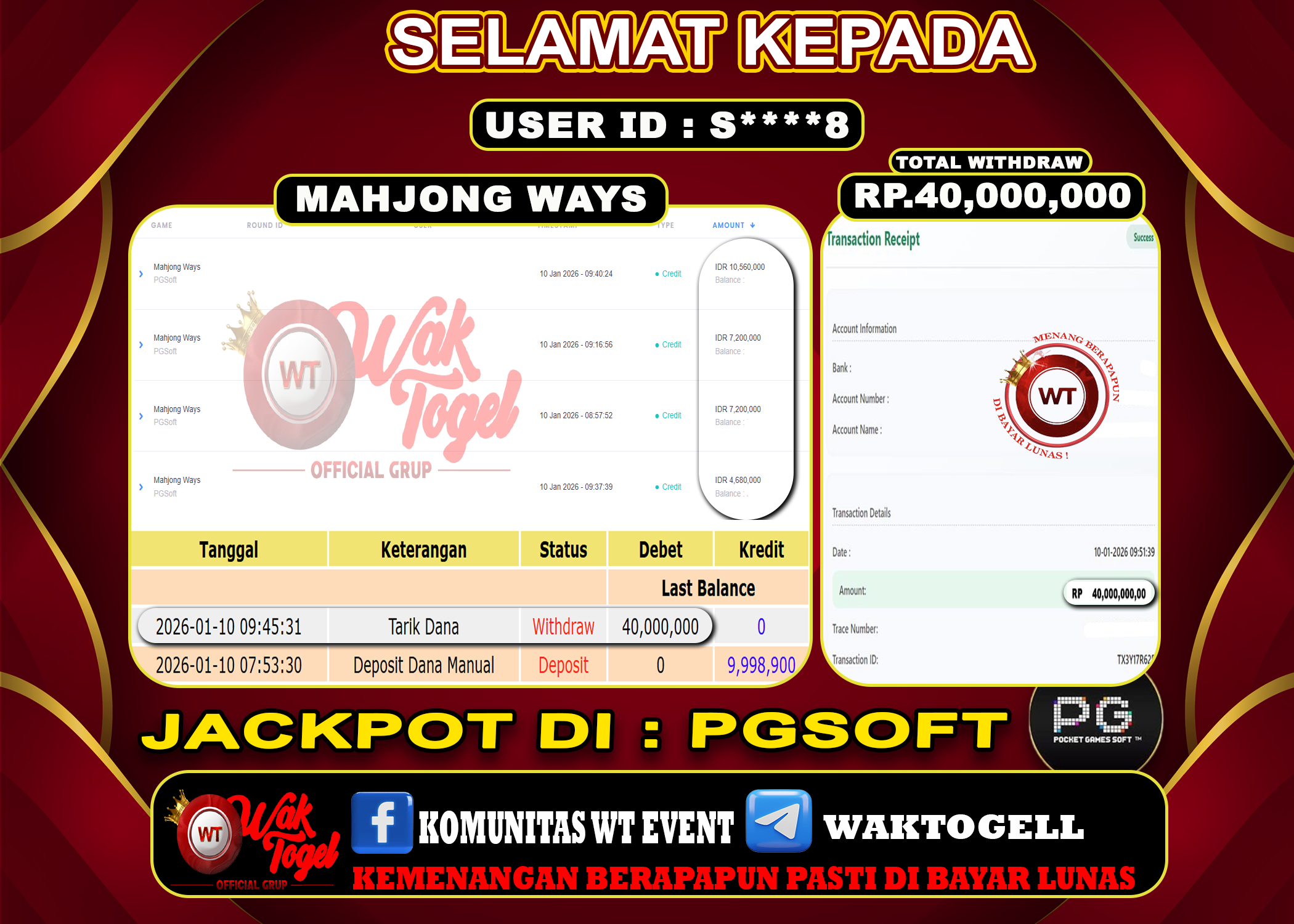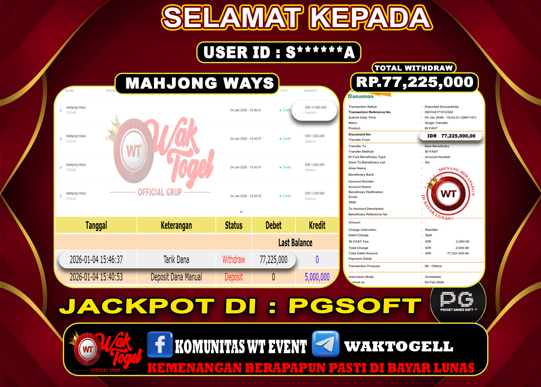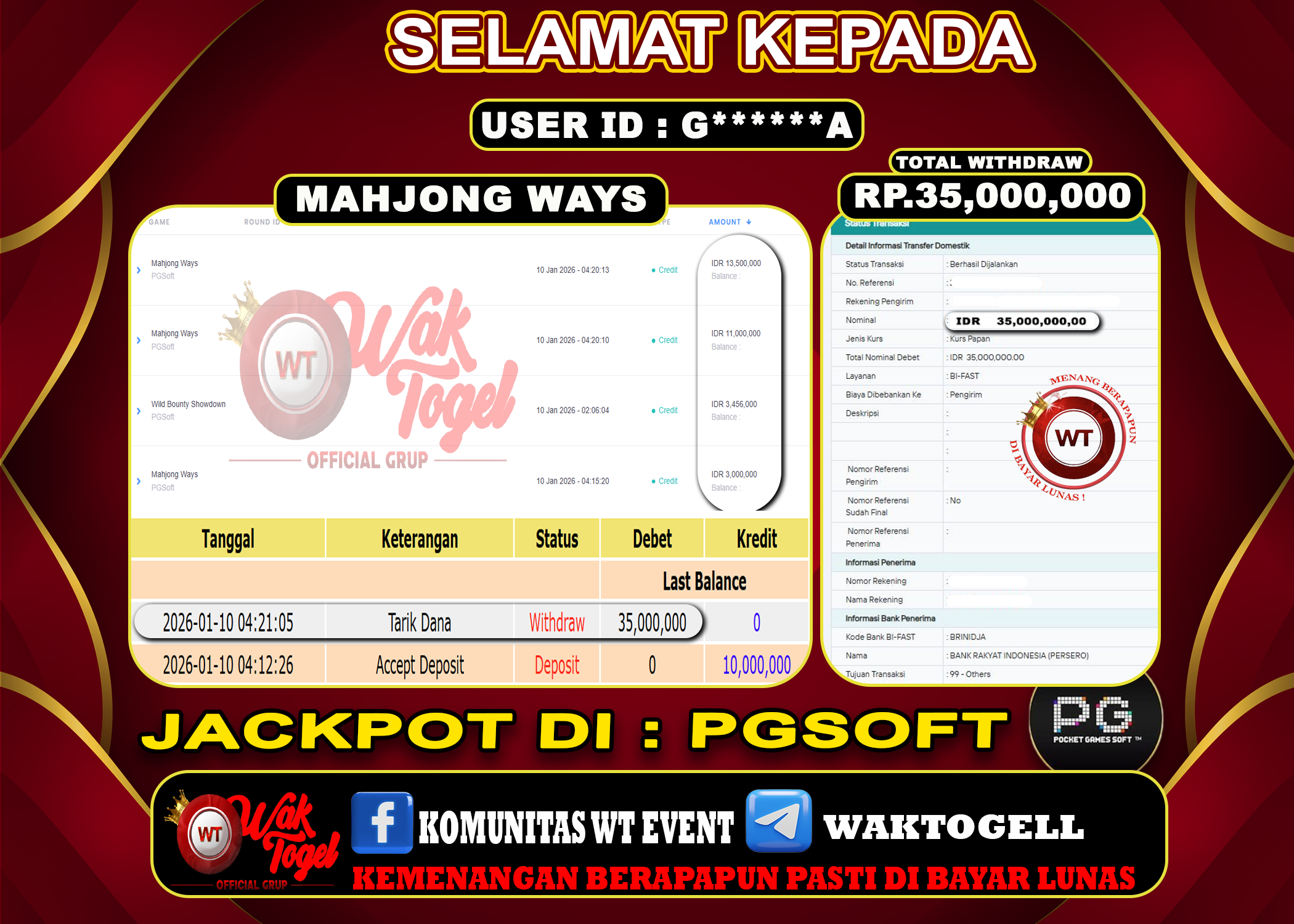 JACKPOT SLOT WAKTOGEL BUKTI PEMBAYARAN SLOT WAKTOGEL By JPWT Januari 10, 2026 0 comments 2 min read BUKTI PEMBAYARAN SLOT WAKTOGEL BUKTI PEMBAYARAN SLOT WAKTOGEL RP. 35,000,000 – GAME : SLOT MAHJONG WAYS (USER ID : G******A TANGGAL |10-01-2026| CASH LUNAS ! […]
