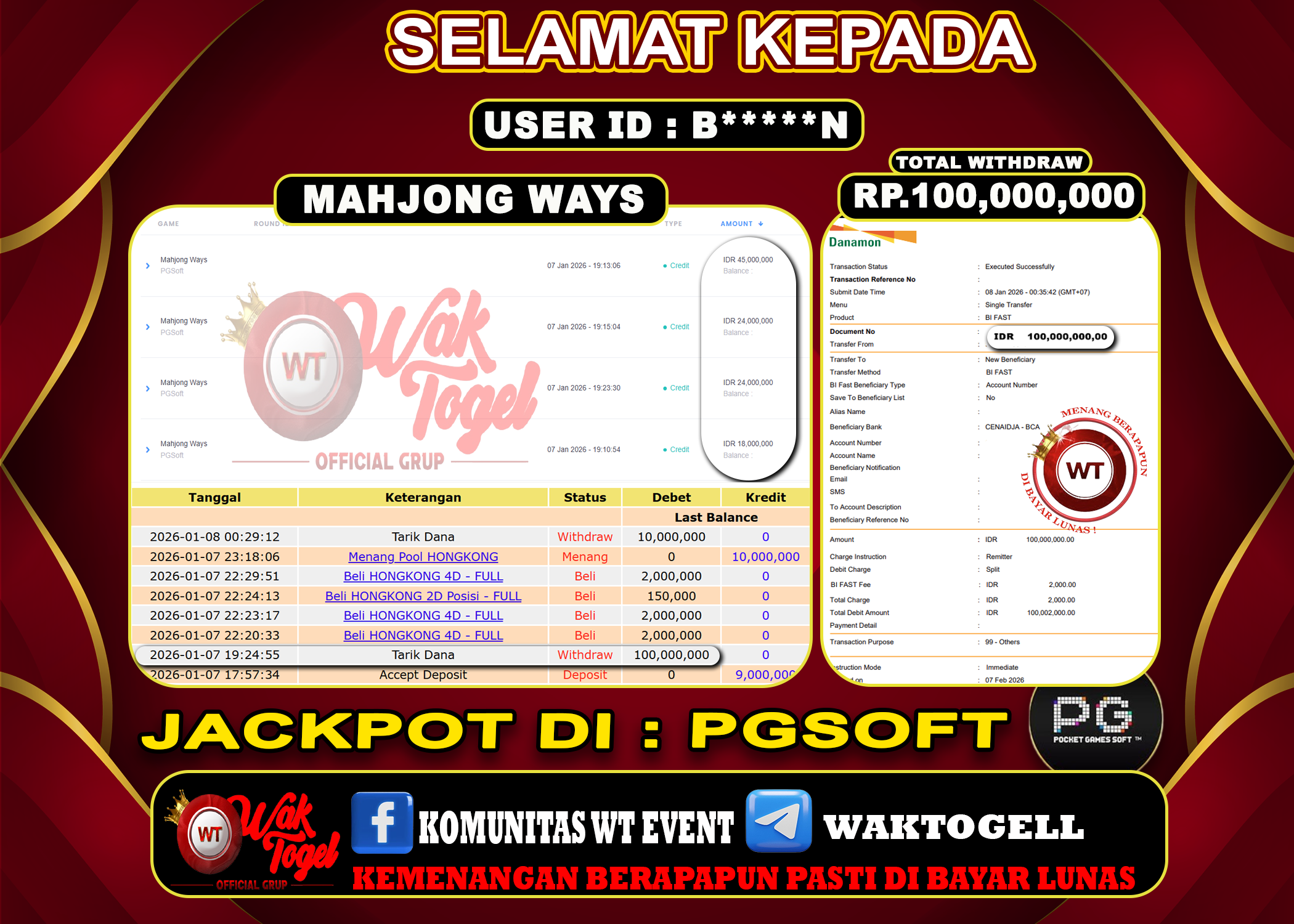 JACKPOT SLOT WAKTOGEL BUKTI PEMBAYARAN SLOT WAKTOGEL By JPWT Januari 8, 2026 0 comments 2 min read BUKTI PEMBAYARAN SLOT WAKTOGEL BUKTI PEMBAYARAN SLOT WAKTOGEL RP. 100,000,000 – GAME : SLOT MAHJONG WAYS (USER ID : B*****N TANGGAL |07-01-2026| CASH LUNAS ! […]
