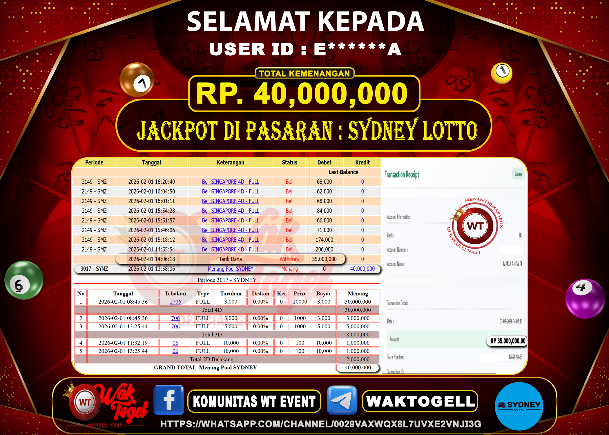 BUKTI PEMBAYARAN SYDNEY WAKTOGEL BUKTI PEMBAYARAN SYDNEY LOTTO WAKTOGEL RP. 40.000.000 – GAME : TOGEL SYDNEY LOTTO (USER ID : E******A) TANGGAL |01-02-2026| CASH LUNAS […]