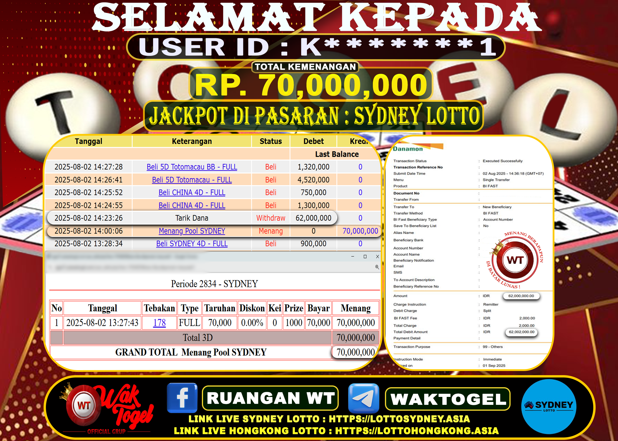 BUKTI PEMBAYARAN SYDNEY WAKTOGEL BUKTI PEMBAYARAN SYDNEY LOTTO WAKTOGEL RP. 70,000,000 – GAME : TOGEL SYDNEY LOTTO (USER ID : K*******1 TANGGAL |02-08-2025| CASH LUNAS […]