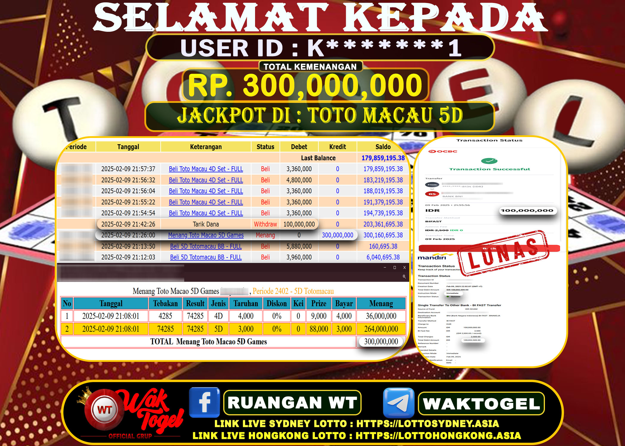 BUKTI PEMBAYARAN TOTO MACAU 5D WAKTOGEL BUKTI PEMBAYARAN TOTO MACAU 5D WAKTOGEL RP. 208,225,000 – GAME : TOGEL TOTO MACAU 5D POOLS (USER ID : […]